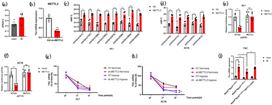 Firstly, by using LC-MS/MS to examine the total m6A level of each group, the myocardial level in MI was higher than that of the sham group (Figure 5a). From SRAMP, a prediction website for exact m6A modification sites, predicted many m6A sites of TNC mRNA in mice and humans (Table 1 and Table 2). We chose HL1 and AC16 cells to demonstrate the potential mechanism. Next, we used sh-METTL3 to decrease the expression of METTL3 in HL1 and AC16 cells, and SELECT technology to examine the predicated m6A sites in TNC mRNA; the data from SELECT technology showed that the proportion of m6A/A in the exact site is less in HL1 and AC16 cells treated with sh-METTL3 compared with the control group (Figure 5b–d). To demonstrate whether METTL3 directly bound the exact m6A site, we mutated the “A” to “T” and used Luciferase Reporter to show that after mutation, the relative luciferase activity of the mutated group was higher than that of the nonmutated group (Figure 5e,f). Finally, to analyze whether METTL3 playing its role in MI regulated the stability of TNC mRNA, we added actinomycin D to analyze the possibility. Actinomycin D mainly acts on RNA and inhibits RNA synthesis. The mechanism of action is that it combines with its guanine group embedded in the double strand of DNA, inhibits the activity of DNA-dependent RNA polymerase, interferes with the transcription process of cells, and thus inhibits the synthesis of mRNA. At the same time, we simulated the myocardial infarction model in vivo by treating the HL1 and AC16 cells under hypoxia conditions (simulating ischemia and hypoxia of myocardial infarction) and normoxia conditions (control group). The hypoxia condition is 95% nitrogen plus 5% carbon dioxide. Therefore, we added Actinomycin D into the HL1 and AC16 cells and then detected the remaining TNC mRNA after 48 h. The result showed under the loss of METTL3, the TNC mRNA stability was lower than that of the presence of METTL3 (Figure 5g,h). Finally, we reexamined the TNC mRNA expression in CKO-METTL3 mice after injecting OE-TNC-AAV9, and it showed that the TNC mRNA level in CKO-METTL3 mice with TNC injection was higher than that of CKO-METTL3 without TNC overexpression (Figure 5i). To sum up, the results demonstrated that METTL3 regulated the m6A modification of TNC mRNA.