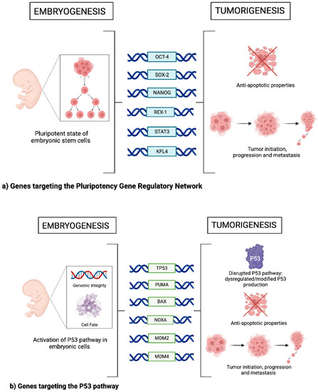 Tumorigenesis, which involves the uncontrolled proliferation and differentiation of cells, has been observed to imitate a variety of pathways vital to embryonic development, motivating cancer researchers to explore the genetic origins of these pathways. The pluripotency gene regulatory network is an established collection of genes that induces stemness in embryonic cells. Dysregulation in the expression genes of the pluripotency gene networks including OCT4, SOX2, NANOG and REX1 have been implicated in tumor development, and have been observed to result in poorer patient outcomes. The p53 pathway is a highly important regulatory process in a multitude of cell types, including embryonic, and the tumor suppressor gene TP53 is widely regarded as being one of the most important genes involved in tumorigenesis. Dysregulations in TP53 expression, along with altered expression of developmentally originating p53 regulators such as MDM2 and MDM4 have been implicated in various cancers, leading to poorer prognosis. Epithelial–mesenchymal transition (EMT), the process allowing epithelial cells to undergo biochemical changes to mesenchymal phenotypes, also plays a vital role in the fate of both embryonic and neoplastic cells. Genes that regulate EMT such as Twist1, SOX9 and REX1 have been associated with an increased occurrence of EMT in cancer cells, leading to enhanced cell stemness, proliferation and metastasis. The class of RNA that does not encode for proteins, known as non-coding RNA, has been implicated in a variety of cellular processes and emerging research has shown that its dysregulation can lead to uncontrolled cell proliferation and differentiation. Genes that have been shown to play a role in this dysregulation include PIWIL1, LIN28A and LIN28B, and have been associated with poorer patient outcomes and more aggressive cancer subtypes. The identification of these developmentally regulated genes in tumorigenesis has proved to play an advantageous role in cancer diagnosis and prognosis, and has provided researchers with a multitude of new target mechanisms for novel chemotherapeutic research.