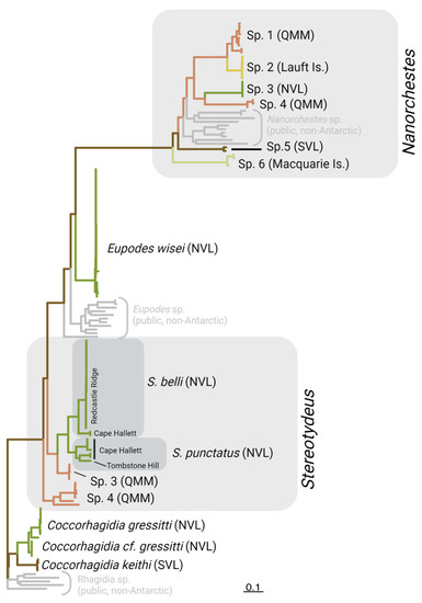 - Brunetti, C.; Siepel, H.; Convey, P.; Fanciulli, P.P.; Nardi, F.; Carapelli, A. Overlooked Species Diversity and Distribution in the Antarctic Mite Genus Stereotydeus. Diversity 2021, 13, 506. [Google Scholar] [CrossRef]