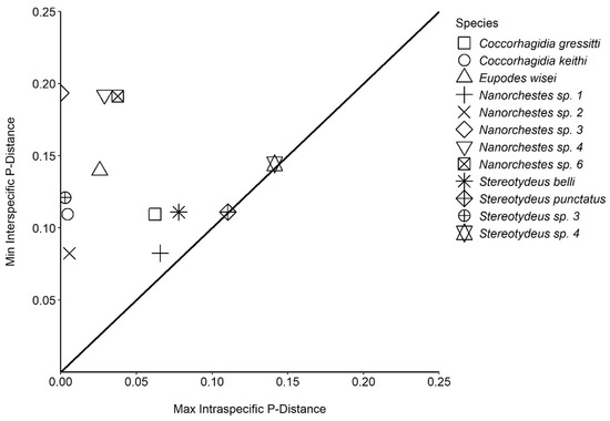 Following DNA extraction, the exoskeletons for some individual specimens were carefully removed from the extract solution and permanently slide-mounted in polyvinyl alcohol (PVA) mounting medium (BioQuip Products, Rancho Dominguez, CA, USA) for morphological assessment. The slide-mounted specimens were then identified with the aid of a compound microscope using the available taxonomic literature e.g., [8,9,40]. All mounted slides are housed at the Canadian National Collection of Insects, Arachnids and Nematodes (Agriculture and Agrifood Canada, Ottawa, ON Canada) and the remainder of the specimens are housed at the Centre for Biodiversity Genomics (University of Guelph, Guelph, ON, Canada). Identifications were possible for 12 specimens representing five currently recognized species. For any uncertainties with species-level identifications, the more conservative genus-level assignment was used.