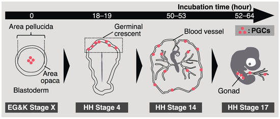 Around HH stage 6 (chick embryos in eggs incubated for 23–25 h), aggregations of endothelial cell progenitors and blood cell progenitors, called blood islands, appear in the extraembryonic mesoderm [37]. Murai et al. demonstrated that more than 60% of quail PGCs in an embryo were enveloped by differentiating endothelial cells forming blood islands in the germinal crescent [38]. Then, the PGCs flowed along with the heartbeat at HH stage 12 (after 48–49 h of incubation). This indicates that most avian PGCs were passively translocated into the vascular system.