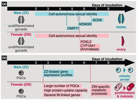 In several vertebrates, the sex of germ cells is affected by gonadal somatic cells following the gonadal migration of PGCs. However, in birds, several researchers have observed the cell-autonomous sexual identity of PGCs (Figure 2b). First, the number of chicken PGCs migrating to undifferentiated gonads is greater in females than in males [40]. Second, chicken PGCs cultured and harvested from female embryos showed a lower tendency for self-renewal compared to those from male embryos [135]; therefore, the culturing of female chicken PGCs was difficult compared to that of male chicken PGCs. Thus, the culture protocol for chicken PGCs has been optimized for each sex [7]. Third, the capacity for protein uptake differs between male and female PGCs [4]. These reports suggest that the sexual identity of initial PGCs is constructed by PGC-intrinsic factors independent of gonadal sex determination.