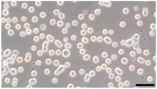 A photograph of cultured chicken primordial germ cells (PGCs). The PGCs were cultured according to a protocol established by Ezaki et al. (2020) [159]. Scale bar = 50 μm.