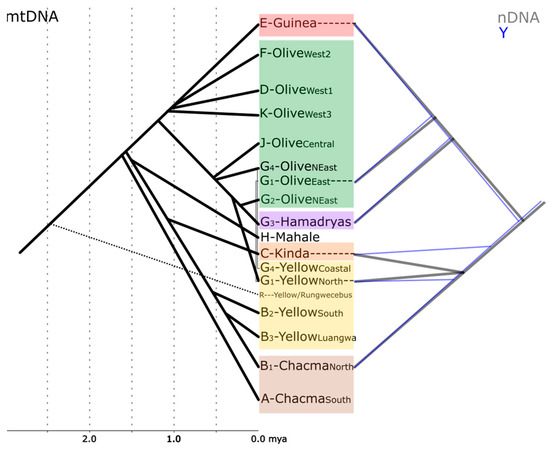 Sketch showing the phylogenetic relationships between baboons based on mtDNA [34,35,37,46,47,48], Y-chromosomes [43], and whole nuclear genomes [18]. Minor subclades are omitted for clarity. Divergence time estimates for Y-chromosomal data do not exist yet [43] and are inconclusive for nDNA [18] and are, therefore, not shown.