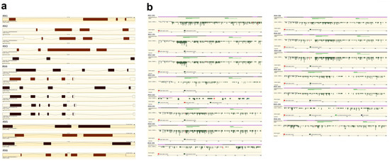 (a) Exon/intron structure of 15 transcripts encoding proteins of the Iroquois family. The figure shows representations of the transcript structures. The protein-coding exons are shown as colored rectangles, and introns are shown as lines. The figure information was retrieved from Ensembl (https://www.ensembl.org/index.html, Last accessed on 19 January 2023). A dark brown transcript comes from either the Ensembl automatic annotation pipeline or manual curation by the VEGA/Havana project. (https://vega.archive.ensembl.org/index.html, Last accessed on 19 January 2023). A light brown transcript is identical between Ensembl automated annotation and VEGA/Havana manual curation. (b) Protein structure of 15 Iroquois transcripts. Exons are colored as light and dark purple. Light green bars represent the domain location in the protein. The figure information was also retrieved from Ensembl.