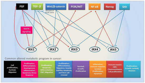 Less information is known about important pathways involving Iroquois genes in cancer. In osteosarcoma (OS), IRX2 modulates the expression levels of MMP2 and VEGF in an AKT-dependent manner, and overexpression of IRX2 promotes the activation of PI3K/Akt and increases the proliferation and invasiveness of OS cell lines [55]. The expression of IRX3 and IRX5 can downregulate TGF-β signaling in human colorectal cancer cells [56]. In tongue squamous cell carcinoma, increased expression of IRX5 is a pro-malignant feature that exerts its role through induction of the NF-kB pathway [57]. In non-small cell lung cancer, increased expression of IRX4 was found to be related to gefitinib resistance and induction of NANOG-mediated responses [58]. Overexpression of IRX1 in osteosarcoma cells (ZOS and MNNG-HOS) increased the degradation of IκBα and the nuclear translocation of NF-κB p65 [59]. A summary of important pathways related to the Iroquois family discussed above is presented in Figure 2.