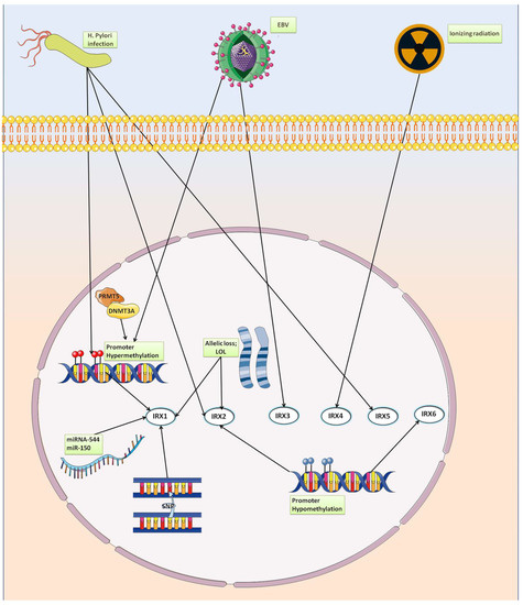 H. pylori is an uncontroversial causal agent of GC [86] and, in 1994, was the first bacterium formally recognized as a human carcinogen type 1 in GC by the International Agency for Research on Cancer (IARC) [87]. A relationship between H. pylori and IRX1 was observed by Guo and colleagues [88], who identified that the levels of IRX1 promoter methylation in tissue DNA from Hp+ chronic gastritis were higher than observed in Hp- chronic gastritis tissues, 55.30% ± 13.17 versus 5.20% ± 6.31, respectively (p < 0.01). They also demonstrated that H. pylori infection induced promoter methylation and reduced IRX1 expression once a higher level of methylation at 12 CpG sites in the promoter region of IRX1 was observed in the GES-1 human gastric epithelial cell line after H. pylori infection compared to the H. pylori negative control [88]. Infection with H. pylori and inactivation of IRX1 genes via promoter methylation or allelic loss seem to be common events related to IRX1 in the development of gastric carcinogenesis.