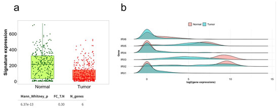 The expression signature of Iroquois genes in GC patients. (a) The gene signature analysis page calculates the means of the selected gene signature across each patient one by one and provides a summary plot using RNA-Seq-based data. (b) Multiple gene analysis provides an overview of the selected gene set in the selected tissue using RNA-Seq-based data.