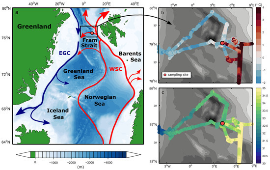 (a) Schematic of the Atlantic water circulation in the Nordic Seas and the near-surface (b) temperature and (c) salinity in the Fram Strait during PS126. The location of the sampling site HG-IV is highlighted as the red circle (4° 22.23′ W, 79° 4.86′ N). On the map, the red arrows represent the northwards flow of warm Atlantic water into the Arctic Ocean as the West Spitsbergen Current, with a large fraction of this water recirculating in the Fram Strait. The blue arrows denote the flow of modified Atlantic water southward within the East Greenland Current along the continental shelf break. The sketched currents are adapted from Beszczynska-Möller et al. [3].