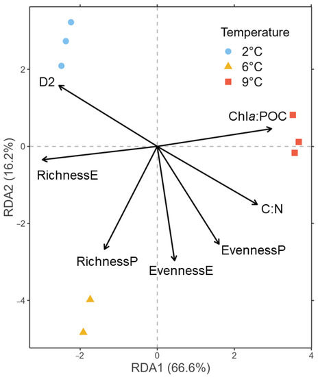 During the ten days of incubation, the communities were neither nutrient- nor carbon-limited (Table S5). Chla:POC was significantly higher and eukaryotic species richness was significantly lower at 9 °C than at 2 °C and 6 °C (Tables S3 and S4). The phenotypic diversity (D2) was significantly lower at 9 °C only compared to 2 °C. All other pairwise t-tests were not significant. The directions of change in all parameters in relation to temperature treatments are visualized in the RDA plot (Figure 2). Here, 66.6% of the variation is constrained by the first RDA axis, with 9 °C associated with a high chla:POC ratio, while eukaryotic species richness increases in the direction of 2 °C and 6 °C. The two lower temperatures spread across the second RDA axis (16.2%), of which 2 °C was associated with high D2. Considering the t-tests, the effects of the C:N ratio, eukaryotic species evenness, and prokaryotic species richness can be considered negligible for the interpretation of the RDA (Table S4).