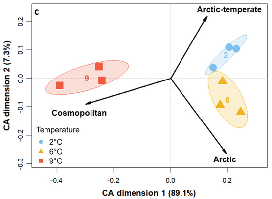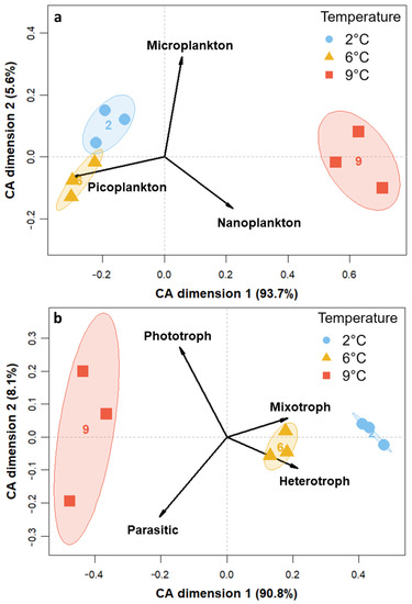 The size classes as well as trophic and thermal groups contributed to the variance among temperature treatments, as is evident from the CA plots in Figure 3. Generally, all replicates of the temperature treatments clustered together. Regarding size differences (Figure 3a), nanoplanktonic individuals (2–20 µm) mainly led to the clustering of 9 °C away from the two other temperatures on CA dimension one, with 93.7% of the variance constrained. On the second CA dimension (5.6%), 2 °C and 6 °C clustered away from each other based on differences in pico- and microplankton read abundances. In terms of trophic mode (Figure 3b), the three temperature treatments mainly spread out along the first axis (90.8%), with 6 °C and 2 °C on one side being gradually dominated more by hetero- and mixotrophy and 9 °C on the other side comprising more phototrophic and parasitic organisms. The replicates at 9 °C also spread out on the second axis (8.1%), along with the explanatory variables phototrophy and parasitism pointing in opposite directions. In the thermal niche CA (Figure 3c), 9 °C samples clustered away from 6 °C and 2 °C along the explanatory variable cosmopolitan on the first axis, which constrained 89.1% of the variance. The variables Arctic and Arctic-temperate pointed towards samples of the two colder temperatures and spread out slightly along the second axis (7.2%).