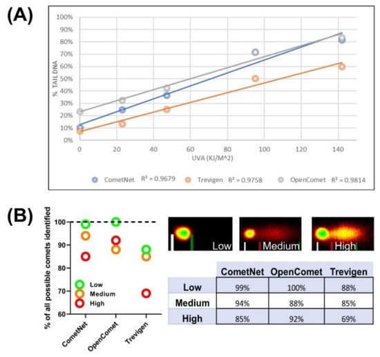 Comparison of the ability of three comet analysis (CAS) software packages to measure DNA damage over a linear range of DNA damage as measured by comet analysis. (A) Damage was induced using UVA (365 nm) light. Each data point represents averages of 100–300 comet cells from replicate biological experiments; r2 = linear regression of data set. (B) Both CometNet and OpenComet were able to identify significantly more comets than the Trevigen software. CometNet vs. Trevigen (p > 0.0001), OpenComet vs. Trevigen (p = 0.0001), n = 26 (technical sets). Comet images show representative comets of high, medium, and low levels of DNA damage.