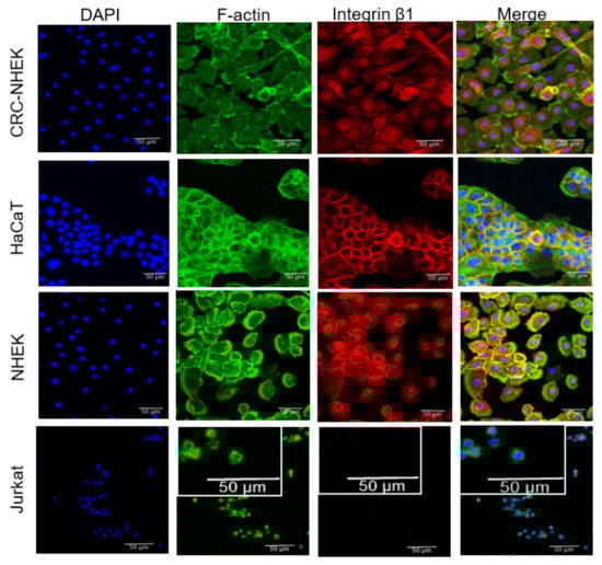 Human keratinocytes, CRC-HFK, HaCaT, and NHEK, but not Jurkat T cells, demonstrate strong integrin-β1 expression. Cells were stained with integrin-β1 antibody and coupled to Qdot-655. Nuclei were stained with DAPI. The cytoskeleton compartment was labeled with FITC-F-Actin. Jurkat cells were used as a negative control.