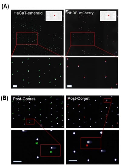 Representative images of dual-cell-type loaded well. (A) Pre-Comet mEmerald-labeled HaCaT and mCherry-labeled fibroblasts, were loaded into a single CometChip macro-well (upper images). Cell position was registered (lower images), and cells were identified using numbering before the CometChip was exposed to lysis and alkaline treatment. (B) Post-comet processing of CometChip shows the position of the differentially labeled fibroblasts and keratinocytes after comet protocol. In the image, fluorescence is SYBR Green DNA staining. The lower images show the registration of the cells and the blue outline around the cells shows the extent of the comet tail. Scale bar = 100 µm.