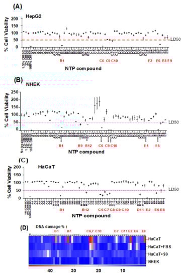 To classify the compounds as damaging agents, we determined their cytotoxicity and genotoxicity profiles. XTT cell viability assays were performed in 2D primary NHEK and HaCaT keratinocytes, as well as in HepG2 cells after exposure to the 57 NTP compounds for 48 h. While most of the compounds were found to be non-cytotoxic at 200 μM, five of the agents were cytotoxic in all three cell lines, as indicated by decreased cell viability compared to the 1% DMSO control (Figure 5A–C). Cytotoxic compounds that reduced viability by >50% in all three cell types tested include B1, C6, C9, C10, and E6 (significance determined using post hoc analysis, including Dunnett’s multiple comparison test). Five compounds were cytotoxic only to HaCaT cells (C7, C8, D11, E2 and E8), and three were cytotoxic to NHEK alone (B9, E1, and E7). CometChip assays were then performed on HaCaT and NHEK keratinocytes following exposure to the same 57 NTP compounds. HaCaT cells were also exposed to compounds in the presence of FBS or pretreated with S9 human liver fractions. In total, 73% (8/11) of compounds that induced cytotoxicity at 200 µM in HaCaT cells at 24 h also induce genotoxicity after either 1 h of exposure at 1 mM, 200 µM at 3 h, or both, while some compounds induced genotoxicity but not cytotoxicity (Table 1). It is important to note that, whereas genotoxicity was tested at an early time point (1 or 3 h), cytotoxicity was examined later (48 h). Thus, it likely that compounds that were identified as both genotoxic and cytotoxic rapidly induced DNA damage, resulting in eventual cell death.