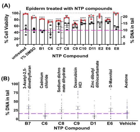 EpiDerm exposed to DNA-damaging agents. EpiDerm was topically exposed to each of the NTP compounds indicated. (A) Cell viability is shown as a histogram, with values on the left y-axis. % DNA in tail is overlaid as a 95% CI dot plot (n = 3), with values on the right y-axis, and a dashed line showing the value for vehicle control (10% DNA in tail). (B) Percent DNA in tail repeated for additional compounds, with dashed red line showing the value for vehicle control. *, **, and **** represent p values < 0.05, 0.01, and 0.0001, respectively.