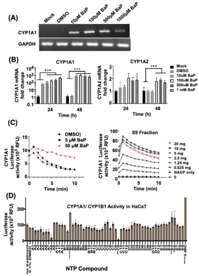 The concentration range for benzo(a)pyrene (BaP)-induced CYP1A1 and CYP1A1 expression was first determined by RT-PCR and qPCR in HaCaT cells (Figure 7A,B). Additionally, CYP luciferase activity was induced by 10 µM BaP. Upregulation of CYP1A1/B1 by BaP was observed previously via binding of the AhR to the dioxin/xenobiotic response elements of the CYP1A1/B1 gene promoter as a heterodimer with ARNT []. CYP1A1 activity assays were verified using two-fold dilutions of liver S9 fractions as a positive control (Figure 7C, right). Consistent with the results of HaCaT cells, human keratinocytes isolated from 3D EpiDerm samples treated with the indicated doses of BaP also exhibited CYP1A1 activity, as shown by CYP450 luciferase activity assays (Figure 7C, left).