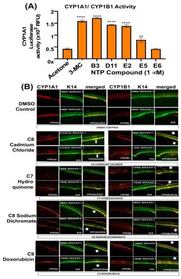 Immunofluorescent staining of EpiDerm treated with NTP compounds confirmed the induction of CYPB1 by additional compounds, whereas CYP1A1 was constitutively expressed (Figure 8B). In agreement with studies of human skin [], CYP1A1 expression was limited to the basal layer, with suprabasal expression of CYP1B1 observed in some cases, including by C6 (cadmium chloride) C7 (hydroquinone), C8 (sodium dichromate), and C9 (adriamycin; Figure 8B). CdCl2 and Na-dichromate are oxidizing agents that are associated with DNA damage, and the upregulation of CYP1B1 was somewhat unexpected; however, it may be due to an indirect activation of the AhR, or AhR-independent CYPB1 pathway, as observed in Ahr−/− mice []. Hydroquinone has also been demonstrated to induce DNA damage in cultured cells []. These results together highlight the importance of testing skin equivalents to understand the activity or inactivity of topical procarcinogens. Both C9 (doxorubicin; Figure 8B) and E2 (curcumin; not shown) also upregulated CYP1B1 in the basal cells of EpiDerm (not shown), as is consistent with previous findings that these two compounds activate the AhR, thus upregulating CYP1A1/1B1 gene expression [,].