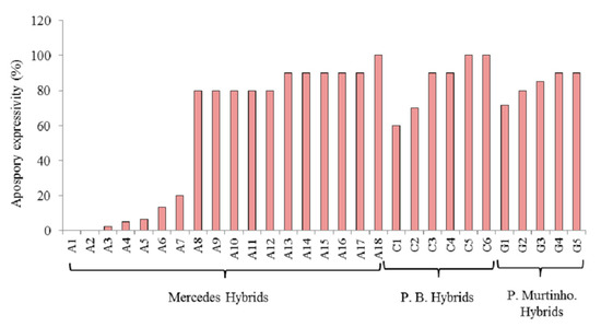 As was mentioned above, the goal in the breeding of apomictic species is to generate superior highly apomictic hybrids. In this way, the superior characteristics will stay stable through growing cycles. The expressivity of the mode of reproduction can be evaluated at two moments: at early stages of the flowering phase or in the progeny [5,19]. The first option represents an advantage over the second in terms of time and resources. However, estimating the expression of apomixis in the progeny makes it possible to determine the offspring homogeneity of an apomictic hybrid, which is an important attribute in a future new apomictic cultivar [5]. In addition, studying the expressivity of apomixis at both stages would make it possible to determine if the levels of apomixis are conserved at flowering and within the resulting pasture. It would be of great interest to determine the expression of the apomixis in the progenies of the novel apomictic hybrids of P. notatum and P. simplex and determine their offspring genotypic variability.