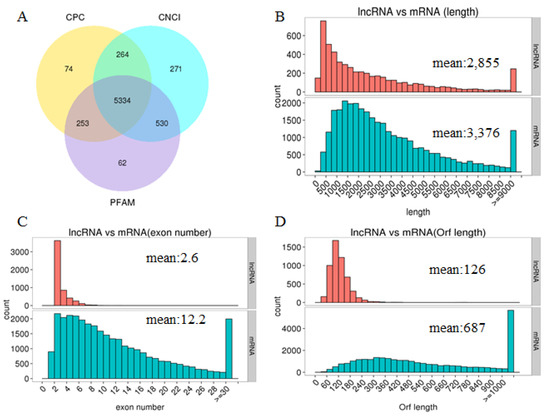 The features of predicted lncRNAs and mRNAs. (A) Venn diagram of lncRNAs from the Coding Potential Calculator (CPC), the Coding-Non-Coding Index (CNCI), and Protein Families Database (PFAM). (B) Length distribution of lncRNAs and coding transcripts. (C) Exon number distribution of lncRNAs and coding transcripts. (D) Orf length distribution of lncRNAs and coding transcripts.