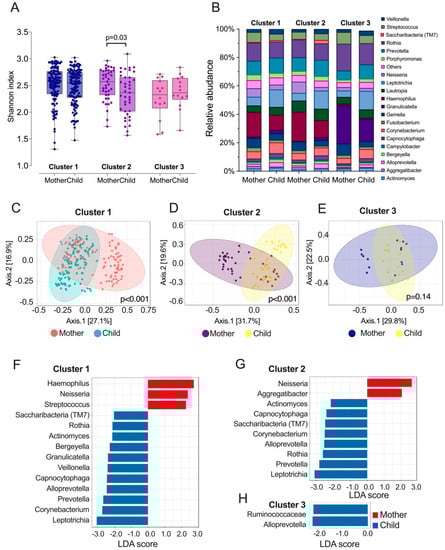 Following cluster assignment, we analyzed the diversity, taxa relative abundance, and differentially abundant taxa at the genera level between the mothers and their children among the three clusters. The α diversity measured by the Shannon index was only significantly different between the cluster 2 mothers and children with less experience of caries (Figure 1A,B). Regarding the β diversity, mothers and children were significantly different in cluster 1 and cluster 2 (Figure 1C–E). In cluster 1, where mothers and children share similar caries experiences, mothers harbor a higher amount of Haemophilus, Neisseria, and Streptococcus, but less Veillonella, Rothia, Prevotella, and Leptotrichia, etc., than their children (Figure 1F). In cluster 2, where the disparity between mothers with caries and children with caries was greater, mothers had a higher abundance of Neisseria and Aggregatibacter, and children were enriched with a higher abundance of Actinomyces, Capnocytophaga, Saccharibacteria, Rothia, Prevotella, and Leptotrichia (Figure 1G). In cluster 3, where children had more caries experience (64.3%), the children’s saliva was more enriched with Rumiococcaceae and Alloprevotella (Figure 1H).