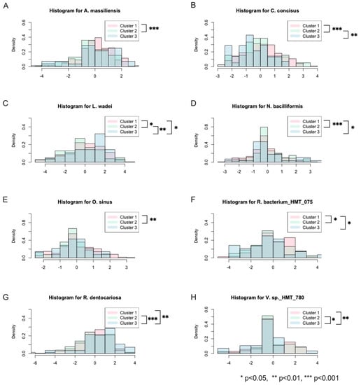 Histograms of significantly different selected OTUs across the three clusters. (A–H) The density of the abundance each OTU within each cluster is represented in a layered fashion to visualize the differences between them.