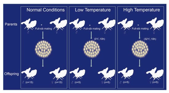 Three full-sib families were reared at different temperatures. For the normal condition family, each individual was reared at 25 °C under a 12:12 h (L:D) photoperiod. For the two temperature-stress-inducing families, eggs after one hour of oviposition were treated with either high temperature (32 °C, 10 h) or low temperature (0 °C, 10 h). Then, all treatment individuals were reared under the same conditions as the normal family.