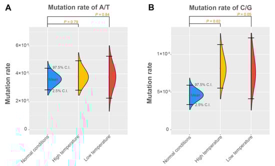 To estimate the mutation rate of the three silkworm families, callable sites and the mutation rate of each offspring of each family were calculated (Supplementary Table S5). Then, the mutation rate was estimated to be 0.41 × 10−8 (95% confidence interval = 0.33 × 10−8–0.49 × 10−8, bootstrap method, see Materials and Methods) in the normal family (Table 1). This value is significantly higher (p = 5.1 × 10−5, X2 test) than the mutation rate observed in four other insect species (0.28 × 10−8 in Drosophila melanogaster, 0.29 × 10−8 in Heliconius melpomene, 0.34 × 10−8 in Apis mellifera and 0.36 × 10−8 in Bombus terrestris) [,,,], suggesting that the spontaneous mutation rate of insect genomes are not as constant as previously claimed. Further, we compared the single-base mutation rate of silkworms under normal and stressed conditions and found that the mutation rate of the high-temperature family (0.58 × 10−8) was significantly (p = 0.04, Student’s t-test) higher than the mutation rate of the normal condition family (Figure 4A, Table 1). The mutation rate of the low-temperature family (0.57 × 10−8) was marginally significant (p = 0.06 using Student’s t-test; p = 0.04 by Wilcoxon rank-sum test) higher than that of the normal family (Figure 4A, Table 1).
