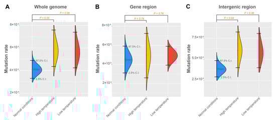 The mutation rates in whole genome, gene region, and intergenic regions of the silkworm under different conditions. The mean value and 95% confidence intervals of the mutation rate of (A) the whole genome, (B) gene region, and (C) intergenic region were shown. The 95% confidence interval of the mutation rate was estimated using bootstrap method with 1000 bootstrap estimates. Student’s t-test was used to evaluate the difference in the mutation rate between each stress-inducing family and normal condition family, and p-value is shown at the top of the figure. The data for the test of significance are the observed mutation rates (per genome) rather than the bootstrap estimates.