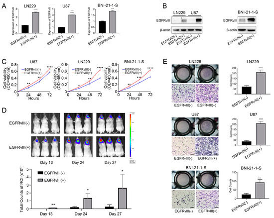 3.2. GBM Cells and Glioma Stem Cells with EGFRvIII (+) Significantly Increased Cell Viability and Cell Migration
