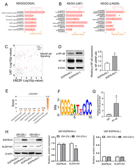 3.5. Screening and Determining That the Downstream Signaling Pathway of EGFRvIII Was Related to the NF-κB Pathway, p- NF-κB in EGFRvIII (+) Cells Was Increased, and NF-κB Bound to the ALDH1A3 Promoter Region