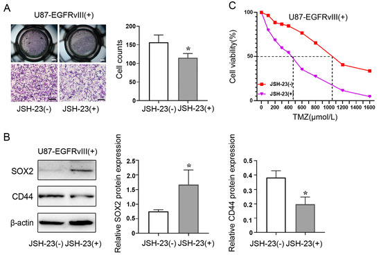 3.6. Inhibition of NF-κB Decreased ALDH1A3 Expression of EGFRvIII (+) Cells, Reversed the Enhanced Cell Migration Ability, Decreased the Expression of PN GBM Marker (SOX2), Increased the Expression of MES GBM Marker (CD44), and Increased the IC50 of TMZ Caused by EGFRvIII (+)