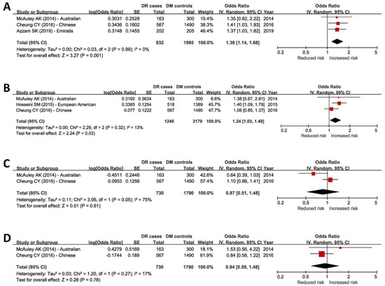 Combined replication outcomes of four genome-wide significant DR GWAS SNPs using meta-analysis A [58,59,60,61]. (A) The combined odds ratio suggested a significant association of the rs4462262 T allele with increased risk of DR (p = 0.001). The minimum heterogeneity was detected using I2. (B) The combined odds ratio suggested a significant association of the rs12219125 T allele with increased risk of DR (p = 0.03). The heterogeneity among the pooled studies was low. (C) The combined odds ratio did not support a significant association of rs12219125 with DR (p = 0.61). The heterogeneity among the pooled studies was high. (D) The combined odds ratio did not support a significant association of rs17376456 with DR (p = 0.78). The heterogeneity among the pooled studies was low. CI, confidence interval; DM, diabetes mellitus; DR, diabetic retinopathy; SE, standard error.