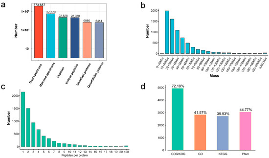The distribution of proteome data and annotations. (a) Overview of protein identification. (b) Length distribution of identified peptides. (c) Peptide count distribution of identified proteins. (d) Protein functional annotation overview of COG/KOG, Gene Ontology, KEGG pathways, and protein domains.
