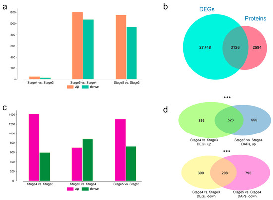 Comparative analysis between differentially abundant proteins (DAP) and differently expressed unigenes (DEGs). (a) Numbers of upregulated and downregulated DAPs at pairwise stages. (b) Venn plot between DEGs and identified proteins. (c) Numbers of upregulated and downregulated DEGs at pairwise stages. (d) Venn plot between DEGs of stage 4 and stage 3 and DAPs of stage 5 vs. stage 4. Upregulated DAPs and DEGs are shown at the top, and downregulated DAPs and DEGs are shown at the bottom. Asterisks indicate degree of significance (*** p < 0.001).