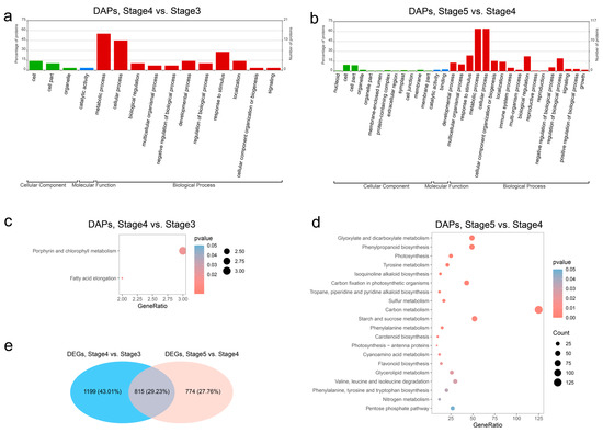 Functional analysis of differentially abundant proteins (DAP). (a) GO classifications of DAPs between stage 4 and stage 3. (b) GO classifications of DAPs between stage 5 and stage 4. (c) KEGG pathways enrichment of DAPs between stage 4 and stage 3. (d) KEGG pathways enrichment of DAPs between stage 5 and stage 4. (e) Venn plot between DEGs of stage 4 vs. stage 3 and DEGs of stage 5 vs. stage 4.