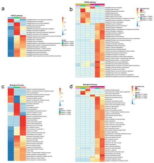 To investigate differences in the functions of DAPs between seed germination and seedling growth, the clustering analyses of KEGG and GO enrichment results were performed. The clustering analysis of KEGG enrichment results indicated that most of the biosynthesis and metabolism pathways were significantly associated with the seedling growth process (stage 5 vs. stage 4), such as “Flavonoid biosynthesis”, “Carotenoid biosynthesis”, “Stilbenoid, diarylheptanoid and gingerol biosynthesis”, “Isoquinoline alkaloid biosynthesis”, “Glucosinolate biosynthesis”, “Phenylpropanoid biosynthesis”, “Tropane, piperidine and pyridine alkaloid biosynthesis”, “Starch and sucrose metabolism”, and “Glycerolipid metabolism” (Figure 5a). Meanwhile, these biosynthesis and metabolism proteins of secondary products were upregulated from stage 4 to stage 5 (Figure 5b). The results suggests that the biosynthesis and metabolism of a large number of secondary products may be of great significance for the seedling growth of T. hispida.