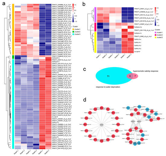 A total of 79 DAPs were involved in the “response to water deprivation” in T. hispida, and the protein abundances of the 79 DAPs are displayed in a cluster heatmap (Figure 6a, Table S6). In Figure 6a, the relatively high and low protein abundances are represented by red and blue segments, respectively. The clustering analysis of the 79 DAPs between the three samples show a clear clustering pattern. Cluster 1 contains 28 DAPs that were upregulated in stage 3 and stage 4, suggesting that these proteins are involved in the water-deprivation response in the seed germination process. Cluster 2 contains 2 DAPs that were upregulated in stage 4 and stage 5. Cluster 3 contains the largest number of DAPs (49) that were uniquely upregulated in stage 5, indicating that these proteins are involved in the water-deprivation response at seedling growth. Meanwhile, 15 DAPs were identified in the “hyperosmotic salinity response” term and were further divided into three clusters, among which cluster 1, cluster 2, and cluster 3 were found to be upregulated in stages 3 and 4, stages 4 and 5, and stage 5, respectively (Figure 6b, Supplementary Table S6). The results showed the DAPs that respond to water deprivation and respond to hyperosmotic salinity have three different abundance patterns, suggesting that there were different proteins in the seed germination process and seedling growth process to play the function of resisting hyperosmotic salinity and water deprivation stress.