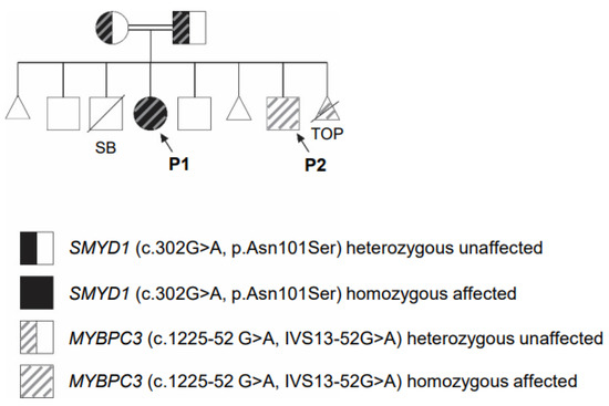 Pedigree of the family carrying the SMYD1 (c.302A>G; p.Asn101Ser) variant and MYBPC3 c.1224-52 G>A (IVS 13-52G>A) variant. Females are represented by circles, males are represented by squares, miscarriages are represented by triangles, termination of pregnancy (TOP) is represented by a triangle and diagonal line, diagonal line indicates deceased and double horizontal lines indicate consanguinity. Both parents are unaffected and heterozygous for both variants, while P1 is homozygous for both SMYD1 and MYBPC3 variants and P2 is homozygous for the MYBPC3 variant (arrows). TOP is homozygous for MYBPC3. The two unaffected male children are not carriers for either gene variant. Male stillborn (SB) deceased at 7 months gestation was not tested.
