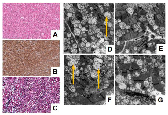 Histological and ultrastructural analyses of cardiac tissue from P2. (A–C) Light microscopy evaluation indicates a preserved architectural myocardial pattern, free of fibrosis and calcifications. (B) Immunohistochemical staining with desmin, showing normal preservation of this intermediate muscle-specific filament. Scale bar = 100 µm. (D–G) Ultrastructural analysis indicates myocardial fibers that show the preserved architecture of the sarcomeric elements; the mitochondria demonstrate reduced and irregular cristae (magnifications: E = 4800×; FG = 6800×). (D,F) Extensive mitochondrial loss of cristae, with some mitochondria almost completely devoid of them, as indicated by arrows (magnification: D = 4800×).