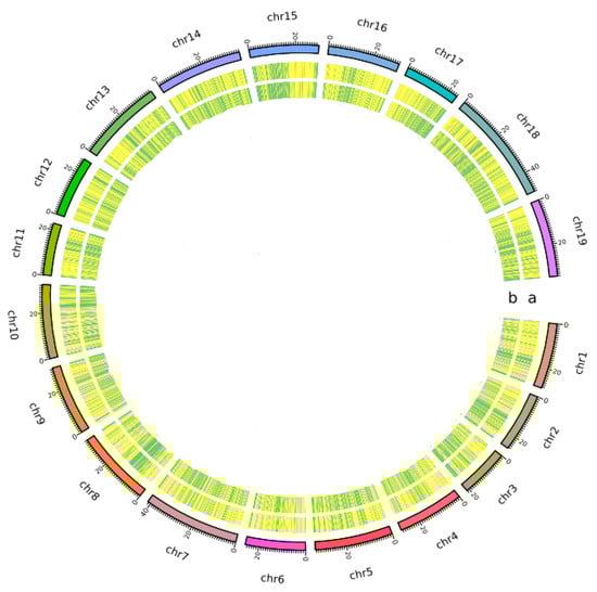 Overall view of the motif distribution of SSRs and SNP density in the genome of nineteen ‘PN40024’ chromosomes (chr1–chr19) was assembled by Hi-C. (a) SSR; (b) SNP.