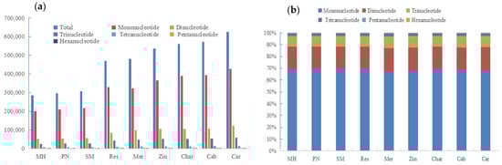 With the rapid development of sequencing technology, many SSR loci can be found quickly and cost effectively by next-generation sequencing (NGS) technology [18,19,45,46]. Whole-genome-based SSR locus mining can be much more efficient and output higher numbers of SSR markers than the method of rapid isolation of repeat containing sequences (fiasco) by amplified fragment length polymorphism (AFLP) or the traditional magnetic bead enrichment method or library, etc. The discovery and mining of SSR loci through genome sequences have been successfully applied to many plant species, including field crops, cash crops and medicinal plants [47,48,49,50,51]. All these do much help in plant genotyping, QTL mapping, and analyzing biodiversity, etc. With grape whole-genome sequencing (WGS), the characterization of the SSR loci is necessary and important.