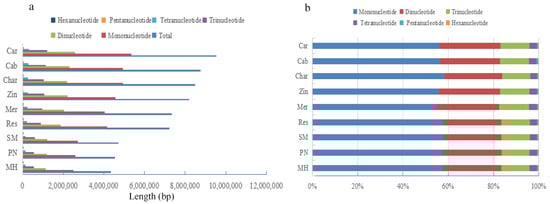 The overall lengths (a) and proportion (b) of microsatellites in genome sequences of different grape varieties.