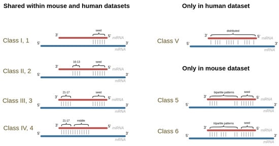 In the same way, considering the miRNAs now, the interaction sites are divided into five classes [], three of which, namely Classes I, II and III, involve a seed at the 5 end of the miRNA. This involvement is either strict (Class I) or concerns the seed plus a region of, respectively, 4 or 5 bases at a shorter (Class II) or slightly longer (Class III) distance from the seed. Regarding the other two classes, as indicated in the CLASH paper [], the binding is either limited to a region located in the middle or the 3 end of the miRNA (Class IV), or it is distributed and less stable (Class V). The proportion of targets in each class varies between approximately 17.8% for the smallest class (Class II) and 25% for the biggest one (Class III); see Figure 1.