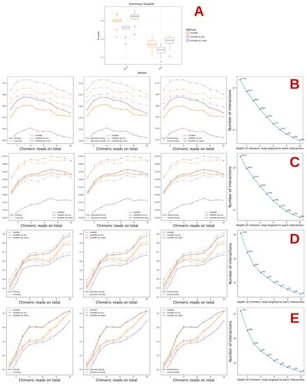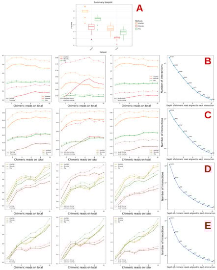 We observe that the results obtained by any method on the miRNA–mRNA datasets are always worse in terms of precision or recall than those obtained when considering Seq, and this occurs in a rather important way (see Figure 2). This is expected, as the amount of noise in the first case is, as mentioned, much higher. There indeed, we consider the whole sequence of the mRNAs for which at least one miRNA–mRNA interaction site has been validated by CLASH, while in the second, we consider only a small region around such interaction sites.