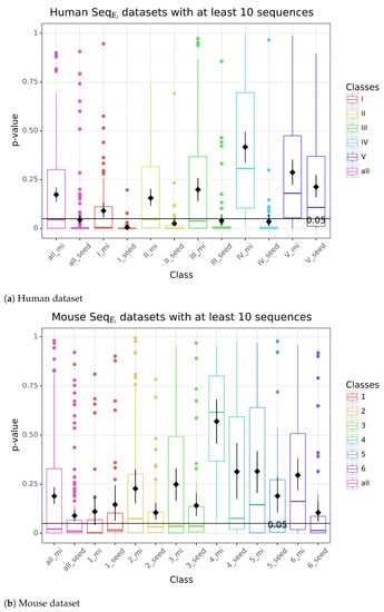 The objective of this section is then to explore this idea in a more systematic way, still using the CLASH data. This exploration will involve first checking if one of the most, if not the most, universally used tool for inferring motifs, namely Meme and its suite [,], is able to associate the exact interaction sites of an miRNA with a statistically significant motif. As concerns the number of miRNAs, which were 399 in human CLASH data, only 316 were thus taken into account, as the remaining 83 ones (approximately 21% of the miRNAs) have only one predicted interaction site. When considering miRNAs that have at least 10 predicted interaction sites, the number goes down to 162 (approximately 41% of the total). Similarly, in the mouse dataset, only 299 of the 378 miRNAs have 2 or more targets (approximately 79% of the miRNAs), and 147 (approximately 39% of the miRNAs) have at least 10 or more identified interaction sites (approximately 39% of the miRNAs).