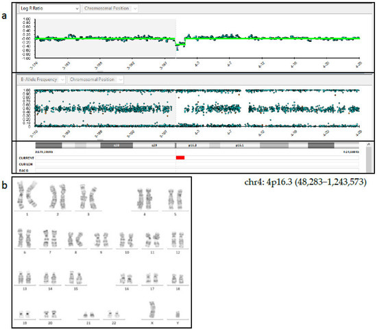 (a) SNP-array analysis of amniotic fluid showed a de novo deletion of 1.2 Mb at chromosome 4: 4p16.3 (48,283–1,243,573). (b) GTG banding on cultured cells from the amniotic fluid showed a 46,XY karyotype.