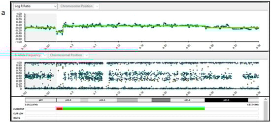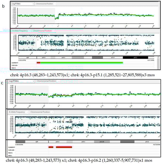 For NIPT analysis, a total of 10 mL peripheral blood was collected at 12 + 3 weeks and NIPT was carried out using VeriSeqTM NIPT Solution v2 assay (Illumina Inc., San Diego, CA, USA) [8,26]. The pregnant woman chose the Genome-wide analysis report, used to receive results about common trisomies (13, 18 and 21) and sex chromosomes, as well as results on rare autosomal aneuploidies and partial deletions/duplications ≥ 7 Mb. NIPT analysis did not detect trisomy in chromosomes 21, 18, and 13. The presence of a Y chromosome was also reported. Moreover, NIPT results indicated a 44.1 Mb duplication on the short arm of chromosome 4: dup(4)(p16.3p12) (Figure 1 and Table 1), with a DNA fetal fraction at 11%.
