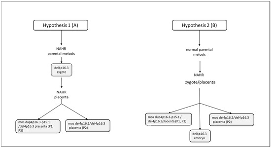 The latter evidence could suggest the hypothesis of an initial formation of a zygote with del 4p16.3 deletion, originating during the parental gametogenesis; later, in the stages of embryonic development, the other genomic rearrangements observed in samples 1, 2 and 3 of the placentas (del4p16.2 and dup4p16.3), due to non-allelic homologous recombination (NAHR), would have originated and been confined to the placenta (Figure 5A. An alternative hypothesis could be an initial formation of a zygote 46,XY, originating during normal parental meiotic events. Then, during the mitotic events of embryonic development, the del4p16.3, in the embryo, mos dup4p16.3-15.1/del4p16.3 (placenta P1 eP3) and mos del4p16.2/del4p16.3 (placenta P2) in placenta were observed, due to non-allelic homologous recombination (NAHR) (Figure 5B). Moreover, we cannot exclude that there may be other mechanisms, since we have not found similar cases in the literature.