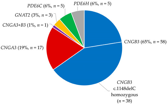 Variants in CNGB3 were the most common cause of ACHM (65.2% of patients; see Figure 1 and Supplementary Table S1), and 65.5% (38 patients) of these patients were homozygous for the variant c.1148delC causing a frameshift and introduction of a premature stop codon (p.T383Ifs*13). The c.1148delC variant accounted for 50.3% of all mutant alleles in our cohort. In one patient, three pathogenic variants were identified: two in CNGB3 and one in CNGA3. We identified one novel pathogenic variant in CNGB3, the other identified variants have been published previously (see Supplementary Table S1) [14,23,25,36,37]. Most variants identified in CNGB3 led to a premature stop codon, and they were most frequently caused by small deletions.